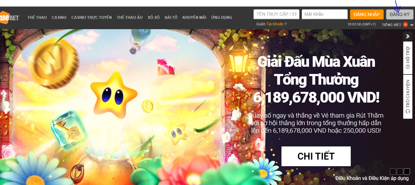 - Sau khi giao diện chính 188bet được mở ra, anh em nhấn vào nút ĐĂNG KÝ bên phía trên góc phải màn hình