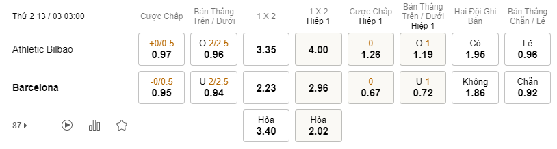 Tỷ lệ kèo Athletic Bilbao vs Barcelona