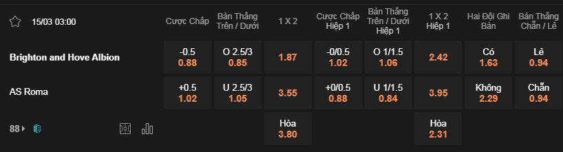 Tỷ lệ kèo Brighton vs Roma
