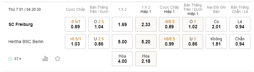 Tỷ lệ kèo Freiburg vs Hertha Berlin