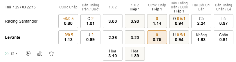 Kèo đấu giữa Racing Santander vs Levante được các chuyên gia phân tích trong kèo thơm vào lúc 22h15 ngày 25/03. Chúc người chơi sẽ có những giờ phút giải trí thú vị.