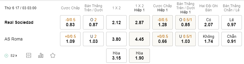 Kèo đấu giữa Real Sociedad vs Roma được các chuyên gia phân tích trong kèo thơm vào lúc 03h00 ngày 17/03. Hy vọng người chơi sẽ có được kết quả đặt kèo thành công như ý.