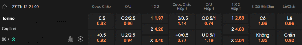 Phong độ thắng kèo của “Il Toro” trong các trận đấu trước những đối thủ ở nhóm dưới là khá ấn tượng. Về tổng bàn thắng, cửa Xỉu (Under) 2.5 được đánh giá rất cao bởi lối đá thực dụng của cả hai đội trong giai đoạn cuối năm. Torino ưu tiên giữ sạch lưới trước khi nghĩ đến việc ghi bàn, trong khi Cagliari chắc chắn sẽ đổ bê tông nhằm tìm kiếm một trận hòa quý giá. Một thế trận giằng co và thiếu vắng các cơ hội ăn bàn rõ rệt là kịch bản rất dễ xảy ra trong suốt 90 phút thi đấu.