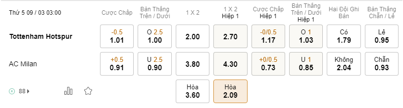 Tỷ lệ kèo Tottenham vs AC Milan