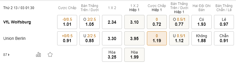 Kèo đấu giữa Wolfsburg vs Union Berlin được các chuyên gia phân tích trong kèo thơm vào lúc 01h30 ngày 13/03. Chúc các người chơi sẽ có được những lựa chọn đặt kèo có xác suất thành công cao nhất.
